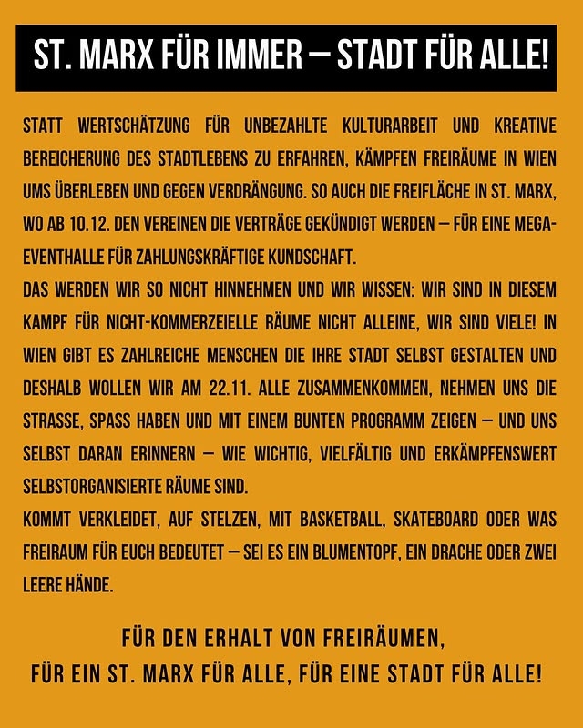 Statt Wertschätzung für unbezahlte Kulturarbeit und kreative Bereicherung des Stadtlebens zu bekommen, sind Freiräume in Wien einem ständigen Überlebenskampf und Verdrängung ausgesetzt. So wie aktuell die Freifläche in St. Marx, wo mit 10.12. den ansässigen Vereinen die Verträge gekündigt werden um Platz für eine Mega Eventhalle für zahlungskräftige Kundschaft zu machen. Das werden wir so nicht hinnehmen und wir wissen: Wir sind in diesem Kampf für nicht-kommerzielle Räume nicht alleine, wir sind viele! In Wien gibt es zahlreiche Menschen, die ihre Stadt selbst gestalten und deshalb wollen wir am 22.11. alle zusammenkommen und uns gemeinsam die Straße nehmen, Spaß haben und mit einem bunten Programm zeigen — und uns selbst daran erinnern — wie wichtig, vielfältig und erkämpfenswert selbstorganisierte Räume in Wien sind.